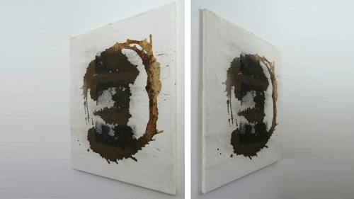 BAD MAN von Marian Kainhofer zeigt einen abstrakten, offensichtlich finster dreinblickenden Mann, gemalt mit Acrylfarben auf Leinwand.