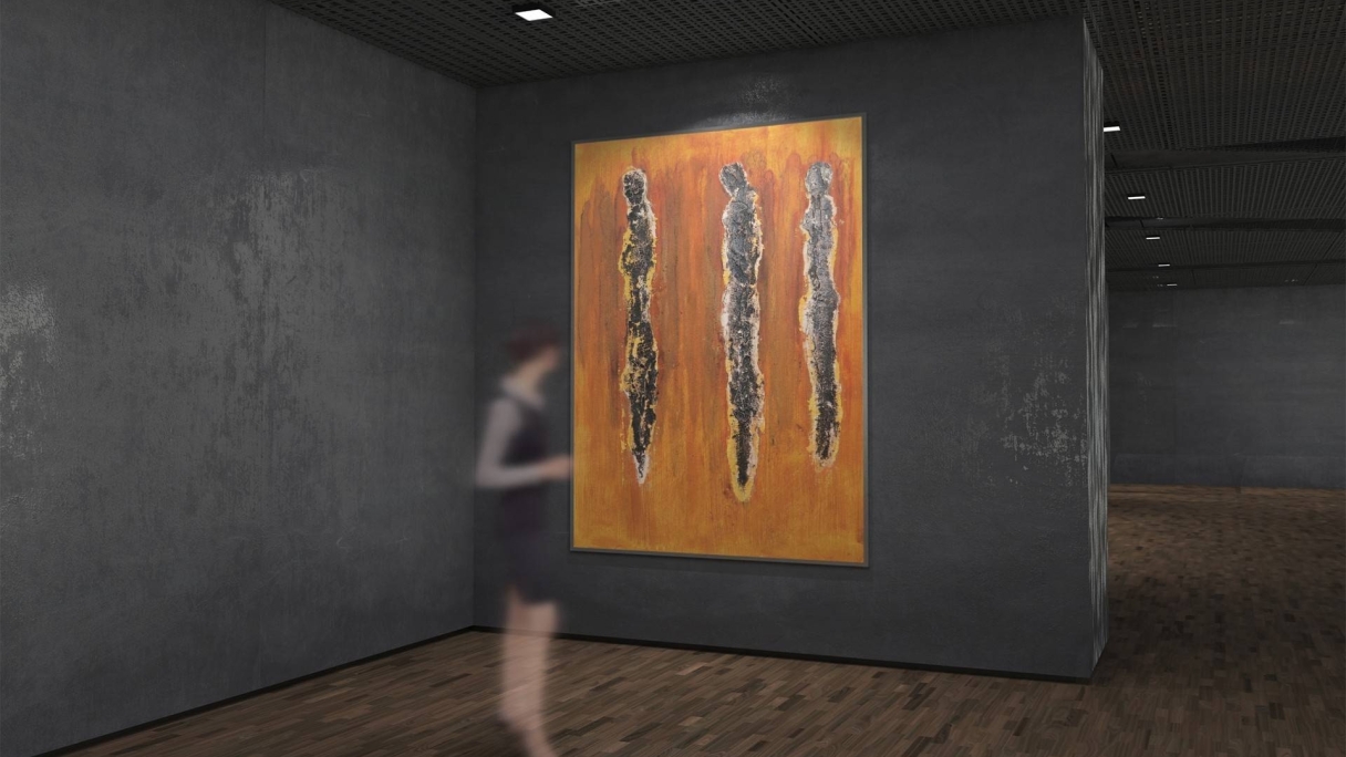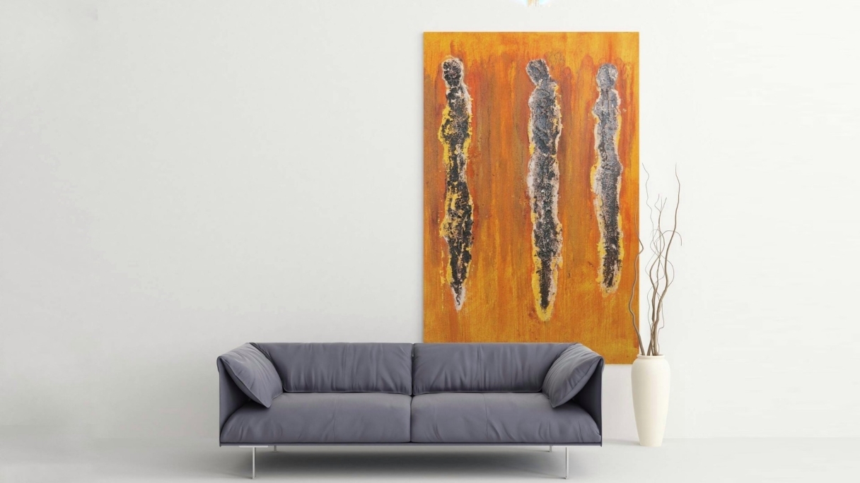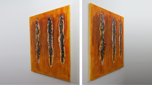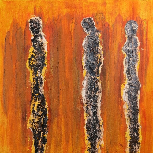 DARK CROWD von Marian Kainhofer zeigt drei dunkle Figuren im Vordergrund und eine skizzenhafte Menschenmenge im Hintergrund. Die leuchtende orange Farbe der Umgebung bricht die dunkle Stimmung des Bildes auf. Acrylfarben, Bitumen und Zeichenkohle auf Leinwand.
