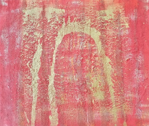 GOLDEN HAIR von Marian Kainhofer ist ein zweiteiliges Werk, das eine Person mit langen goldenen Haaren auf einem tiefroten Hintergrund zeigt. Acrylfarben auf Leinwand.