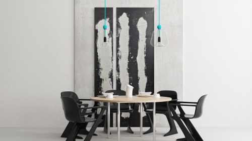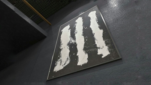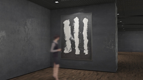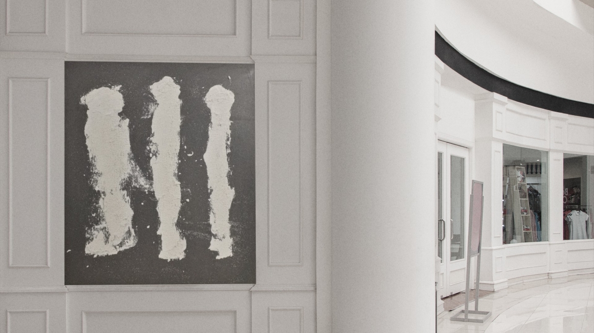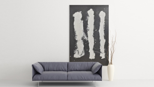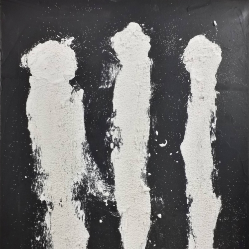 WHITE CROWD von Marian Kainhofer zeigt drei weiße Figuren auf schwarzem Hintergrund. Gemalt mit Acrylfarben auf Leinwand.